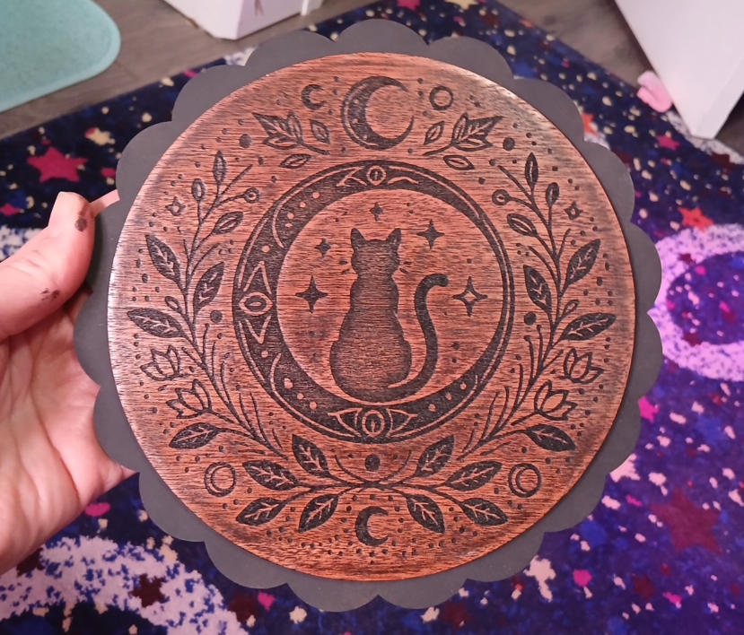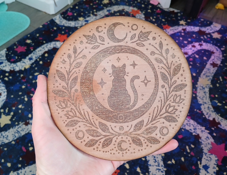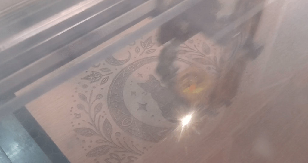 Now, we don’t make pizza, we make things with lasers, like this decoration I am engraving right here. It’s got a cat on it, and I freaking love that.