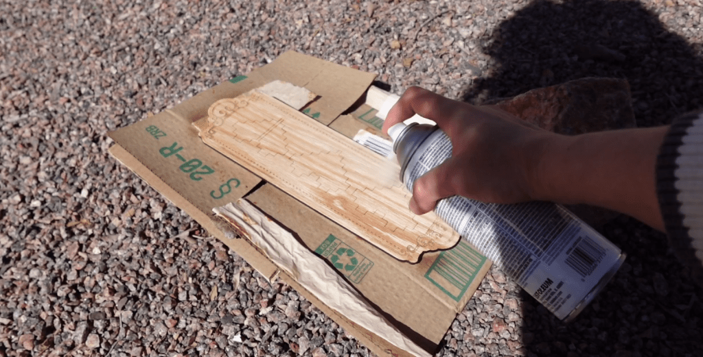 After I sanded down this piece, it is ready for some spray can varnish. These aren’t meant to be outdoors, so this Rustoleum Clear Spray works great! It makes the piece shine, unless you get a matte finish, and really pops out the amazing wood grain patterns.