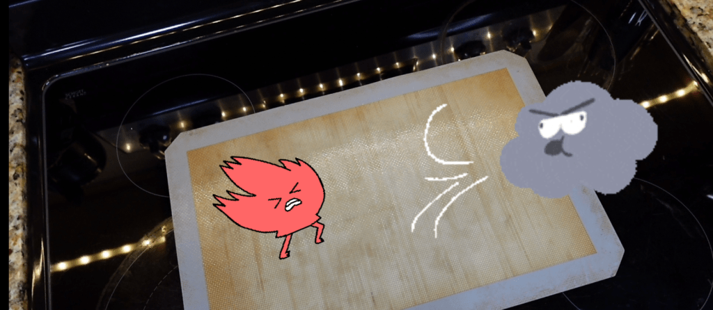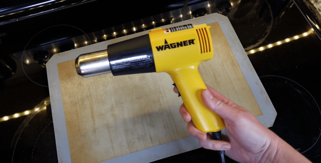 I will be using my stovetop as my heat safe base and on top of that I like to use this Silicone Baking Mat. When we are using fast hot air to blow things around, this tends to keep little bits in place and can handle the heat.