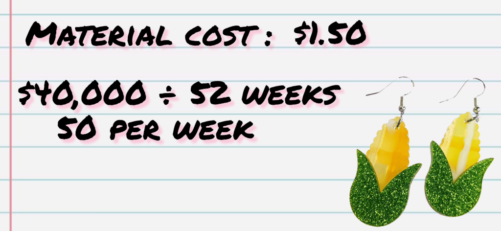 Ask yourself how much you want to make a year. Let’s say $40,000. How many corn earrings could you make in a week? Obviously, you’d probably be making other designs, but let’s focus on corn. I bet I could make 10 a day, that’s 50 a week.