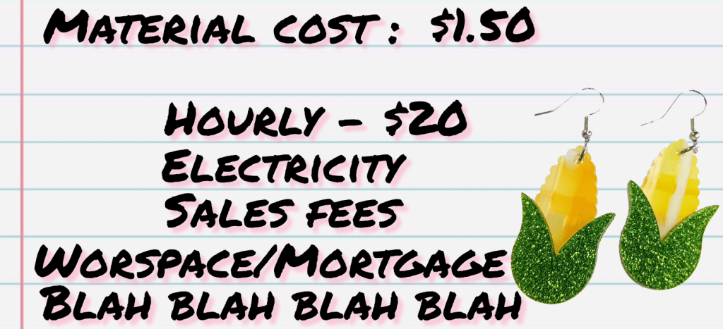 Let’s use these Corn Cob Earrings as an example. The breakdown of the cost to produce, such as the acrylic and packaging is about $1.50.