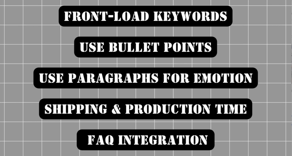 Sometimes when you have a dead or dying listing, it is worth it to look at your description and make sure it is a quick and easy read for you potential customers and catering to all those internet algorithms at the same time. We talked a bit about keywords and tags, so let’s quickly cover that next.