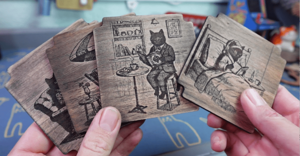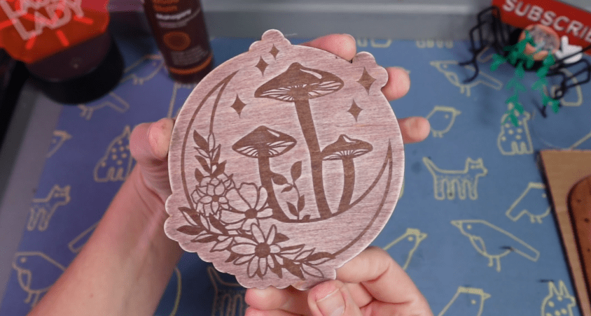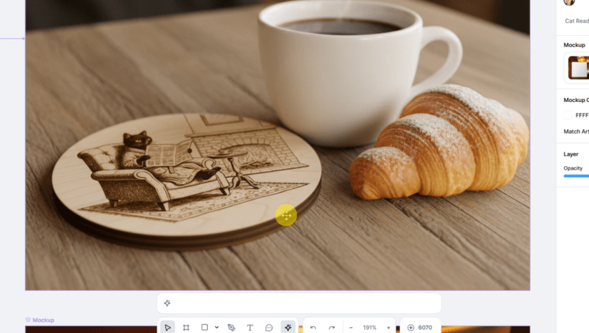 You can also level up your photo editing game with some awesome mockups. There is an entire customizable mockup generator or use your design in a new smartboard prompt for a laser engraved coaster on a cafe table! It even captured the look of plywood on the sides, pretty cool!