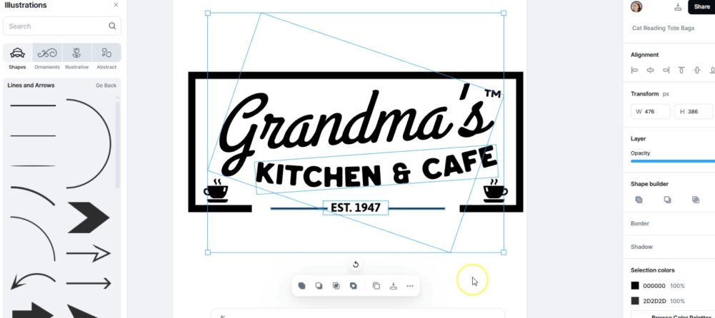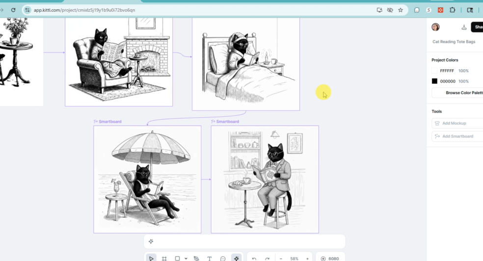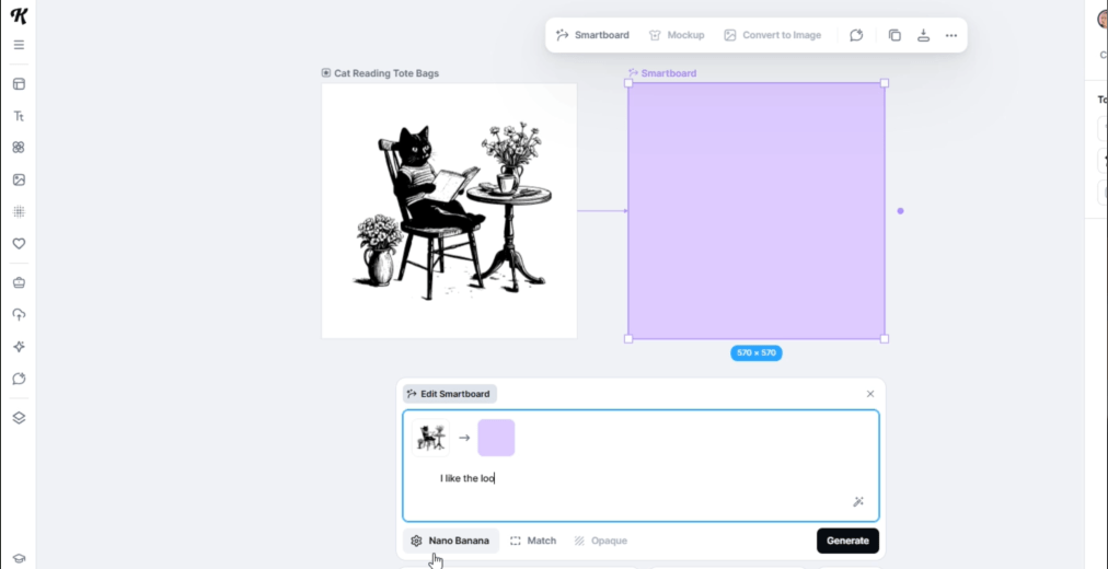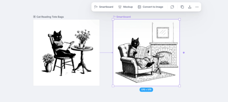 I like the look of this old-style line drawing. Bonus points because it’s a cat. However, I don’t quite want this design, so let’s use some AI magic. With the smartboard function, I don’t have to be that great at prompting to imitate this available art.