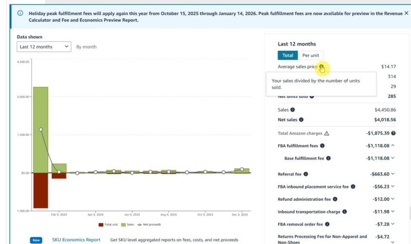 All the fees for FBA are listed here. Since I’ve run some sales, the average price is $14.17. Sold 314 units, 29 have been returned, so a total of 285 successful sales. After the returns, this means these brought in $4018.56.