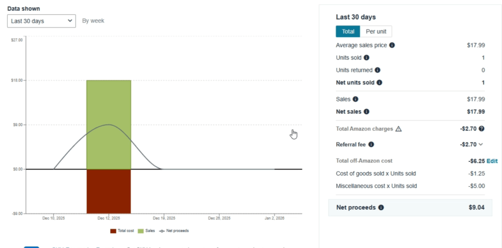 So far, the fees are about half to sales cost. A little over, but to quickly estimate your profit, let’s just say half. Fees will depend on your category so yours could be less or more.