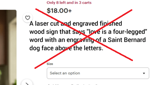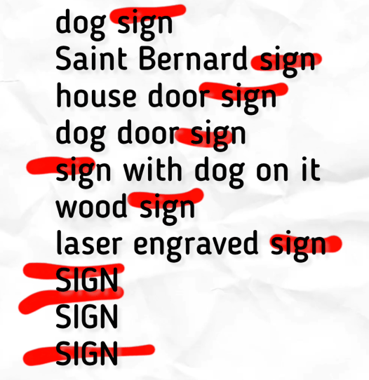 We don’t want to just describe what it is again. So tags that repeat are redundant, like: dog sign, saint bernard sign, house door sign, dog door sign, sign with dog on it, wood sign, laser engraved sign, sign sign sign…. Plus, who is actually searching for laser engraved sign? That is a complete waste of a tag.