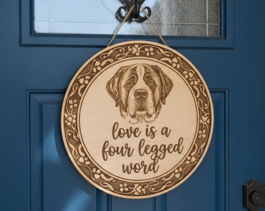 Like this, “A laser cut and engraved finished wood sign that says, “love is a four legged word” with an engraving of a saint Bernard dog face above the letters.” Which is what it is, and the exact ai prompt I used to generate this image.