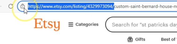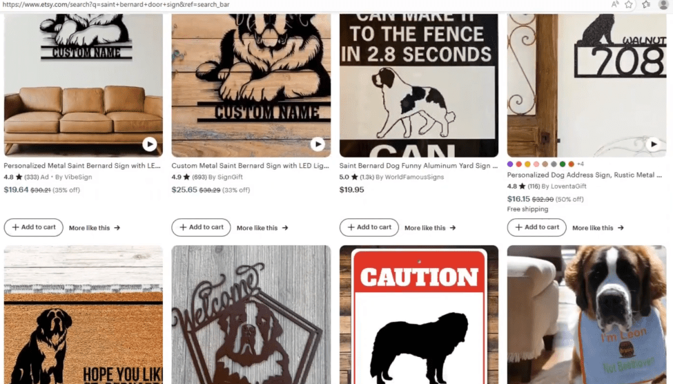 Open an incognito window and search for like items on Etsy. Find one that seems to be selling pretty well. Scroll down to the bottom where it says, “Explore more related searches”. These searches have been linked to this product. I wouldn’t have thought about “Saint Bernard Garden” as a tag, but that could be a good tag to pursue for our outdoor sign listing.