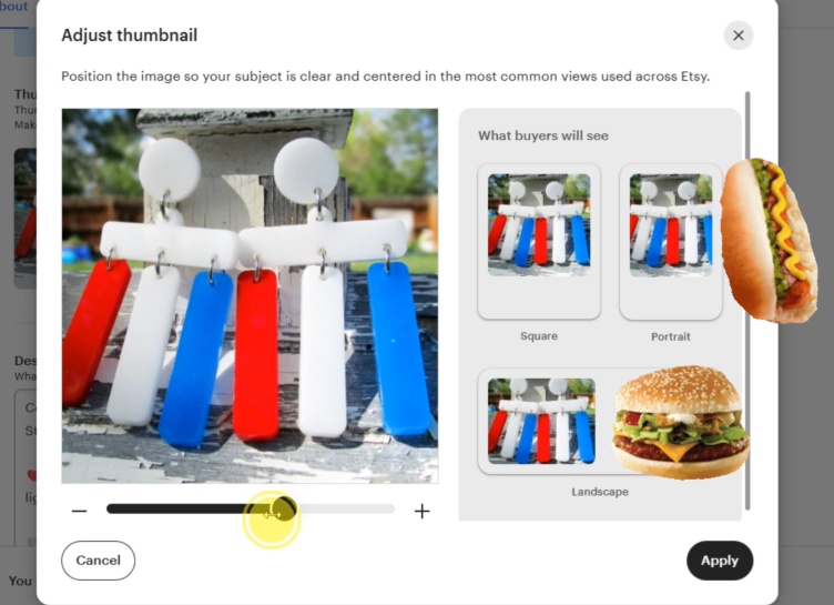 Depending on where you are looking, Etsy will show your product as 1:1 scale, as well as portrait and landscape.