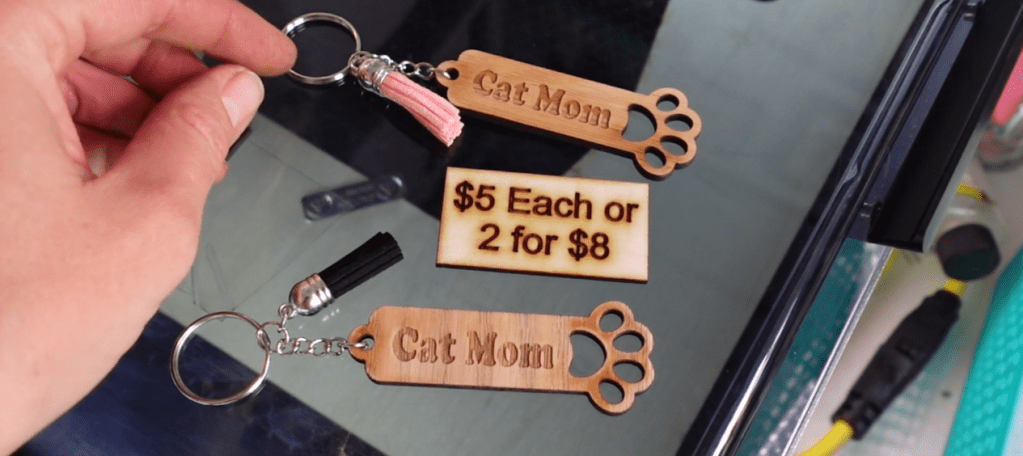 Since they are made of scraps, the cost is technically free. The laser time, 3-4 minutes, $0.50. Your total time sanding and putting on a key ring, about 5 minutes — $1.50. Overhead: $2.00. Real cost: $4.00. At 2.5x that’s $10.